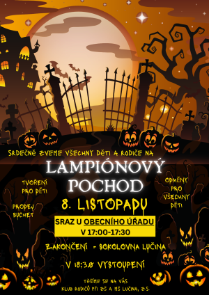 Klub rodičů při ZŠ a MŠ Lučina srdečně zve všechny děti a rodiče na LAMPIÓNOVÝ POCHOD, který se koná v pátek 8.11.2024. Sraz u obecního úřadu v 17 - 17:30 hodin. Zakončení na Sokolovně u fotbalového hřiště. Více info v přiloženém plakátu.