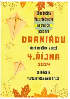 Obec Lučina Vás srdečně zve na tradiční podzimní DRAKIÁDU, která proběhne v pátek 4. října 2024 od 16.00 hodin v areálu fotbalového hřiště. Viz. přiložený plakát.