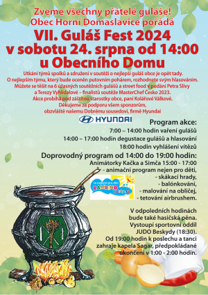 Obec Horní Domaslavice srdečně zve všechny přátele guláše na VII. GULÁŠ FEST 2024, který se koná v sobotu 24. srpna 2024 od 14.00 hodin u Obecního domu. Můžete se těšit na bohatý program, který naleznete v přiloženém plakátu.