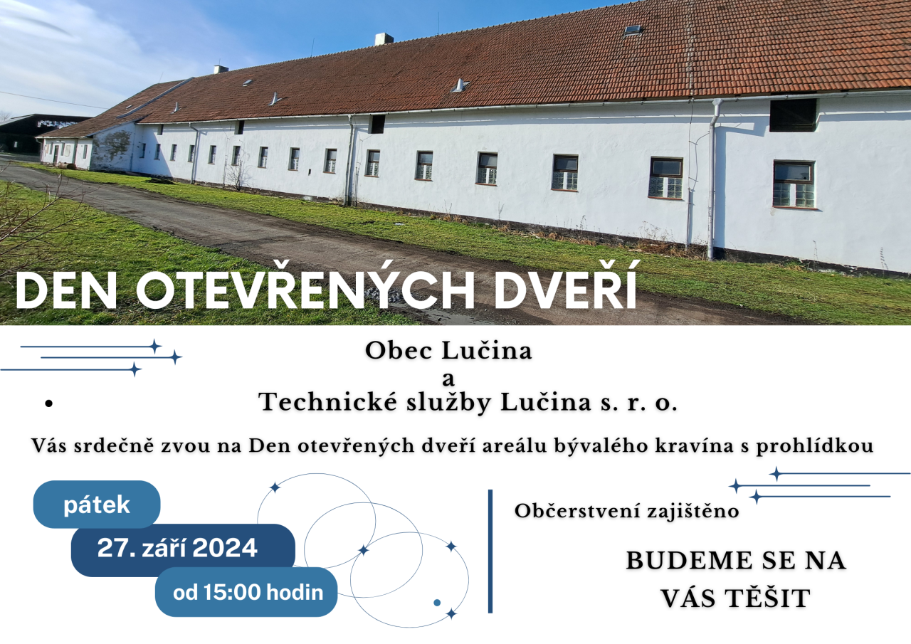 Obec Lučina a Technické služby Lučina s. r. o. Vás srdečně zvou na Den otevřených dveří areálu bývalého kravína s prohlídkou v pátek 27. září 2024 od 15 hodin.