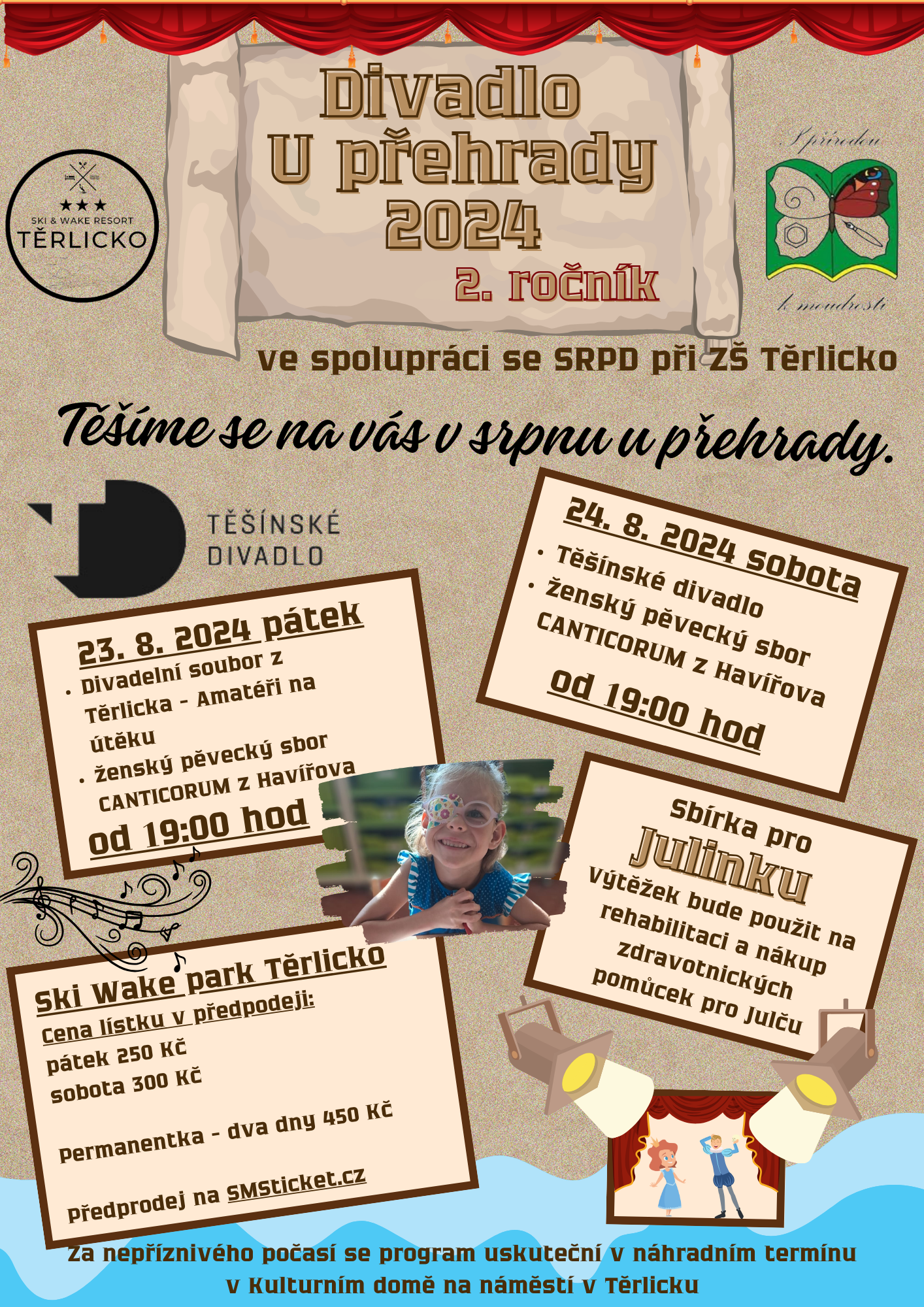 Ski & wake Resort Těrlicko ve spolupráci se SRPD při ZŠ Těrlicko pořádají "Divadlo U přehrady 2024 - 2. ročník". Program naleznete v přiloženém plakátku. Za nepříznivého počasí se program uskuteční v náhradním termínu v Kulturním domě na náměstí v Těrlicku.