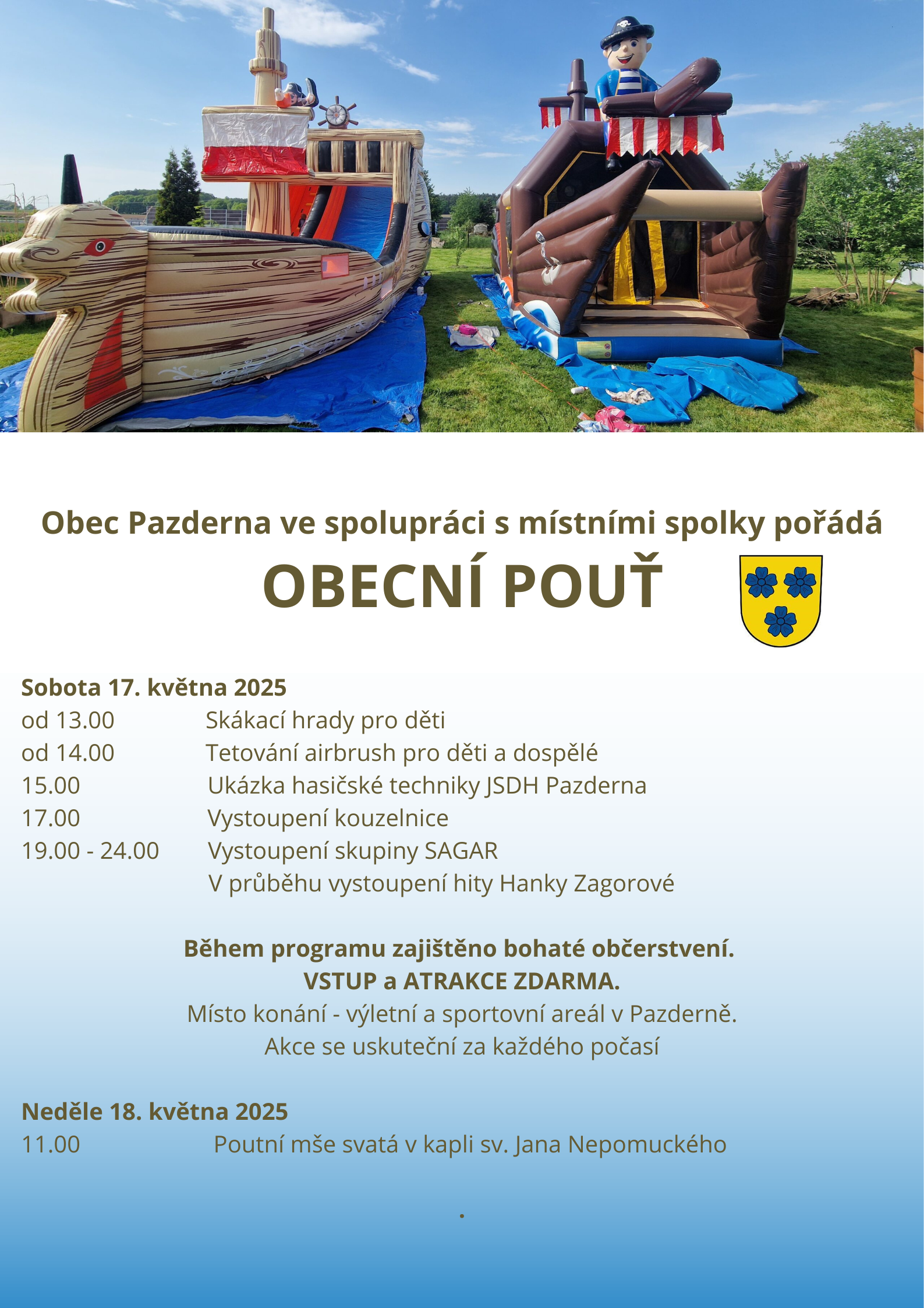 Obec Pazderna ve spolupráci s místními spolky pořádá OBECNÍ POUŤ v sobotu 24. května 2025. Místo konání - výletní a sportovní areál v Pazderně. Během programu bude zajištěno bohaté občerstvení. Vstup a atrakce ZDARMA. Akce se uskuteční za každého počasí. Program naleznete v příloze.