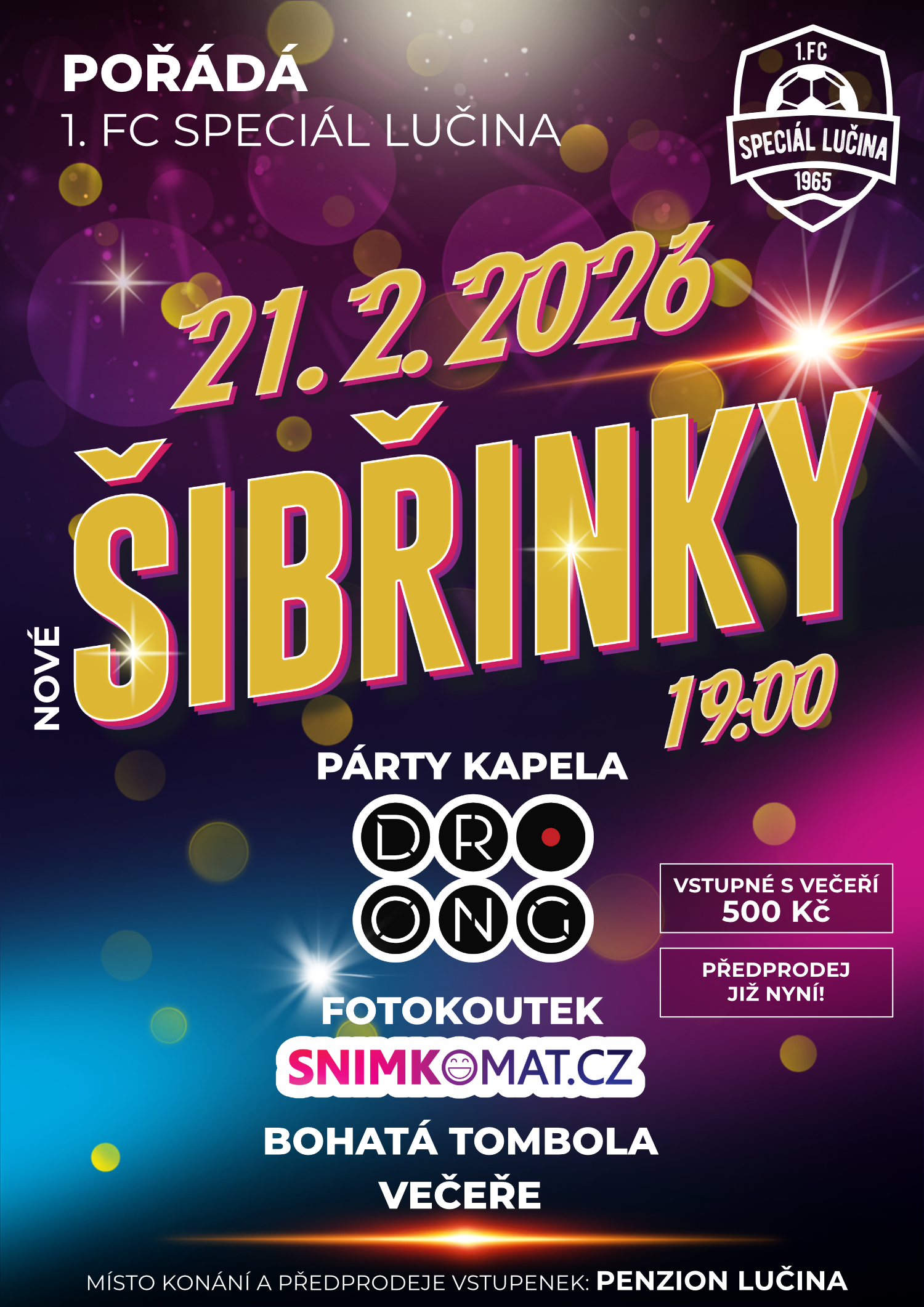 1. FC SPECIÁL LUČINA Vás srdečně zve na ples ŠIBŘINKY, který se koná dne 21.02.2026 od 19:00 hodin v Penzionu Lučina. Můžete se těšit na párty kapelu Drong, fotokoutek i bohatou tombolu. Vstupné s večeří je 500 Kč. Předprodej již nyní!