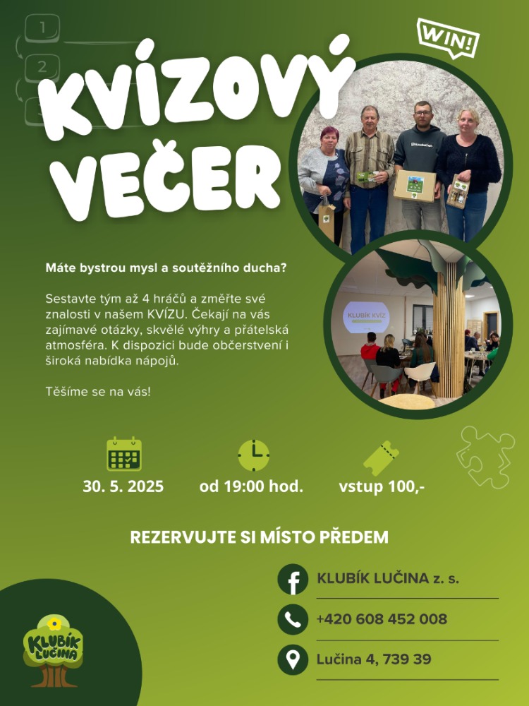 Klubík Lučina Vás srdečně zve na KVÍZOVÝ VEČER, který se bude konat dne 30.05.2025 od 19 hodin. Vstup 100 Kč. K dispozici bude občerstvení i široká nabídka nápojů. Rezervujte si místo předem na tel. čísle +420 608 452 008. Více informací v přiloženém plakátku.