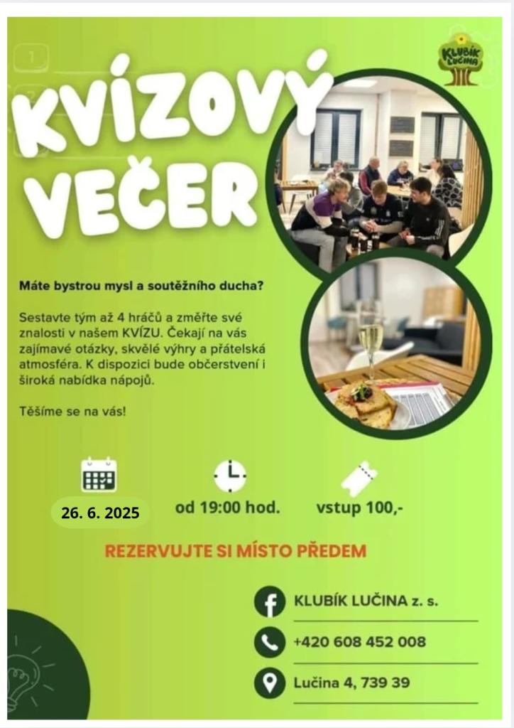 Klubík Lučina Vás srdečně zve na KVÍZOVÝ VEČER, který se bude konat dne 26.06.2025 od 19 hodin. Vstup 100 Kč. K dispozici bude občerstvení i široká nabídka nápojů. Rezervujte si místo předem na tel. čísle +420 608 452 008. Více informací v přiloženém plakátku.
