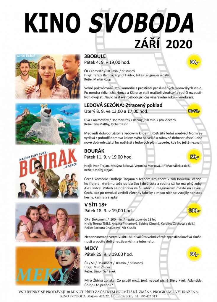 Program kina Svoboda v Těrlicku na měsíc září a říjen 2020 viz. příloha.
