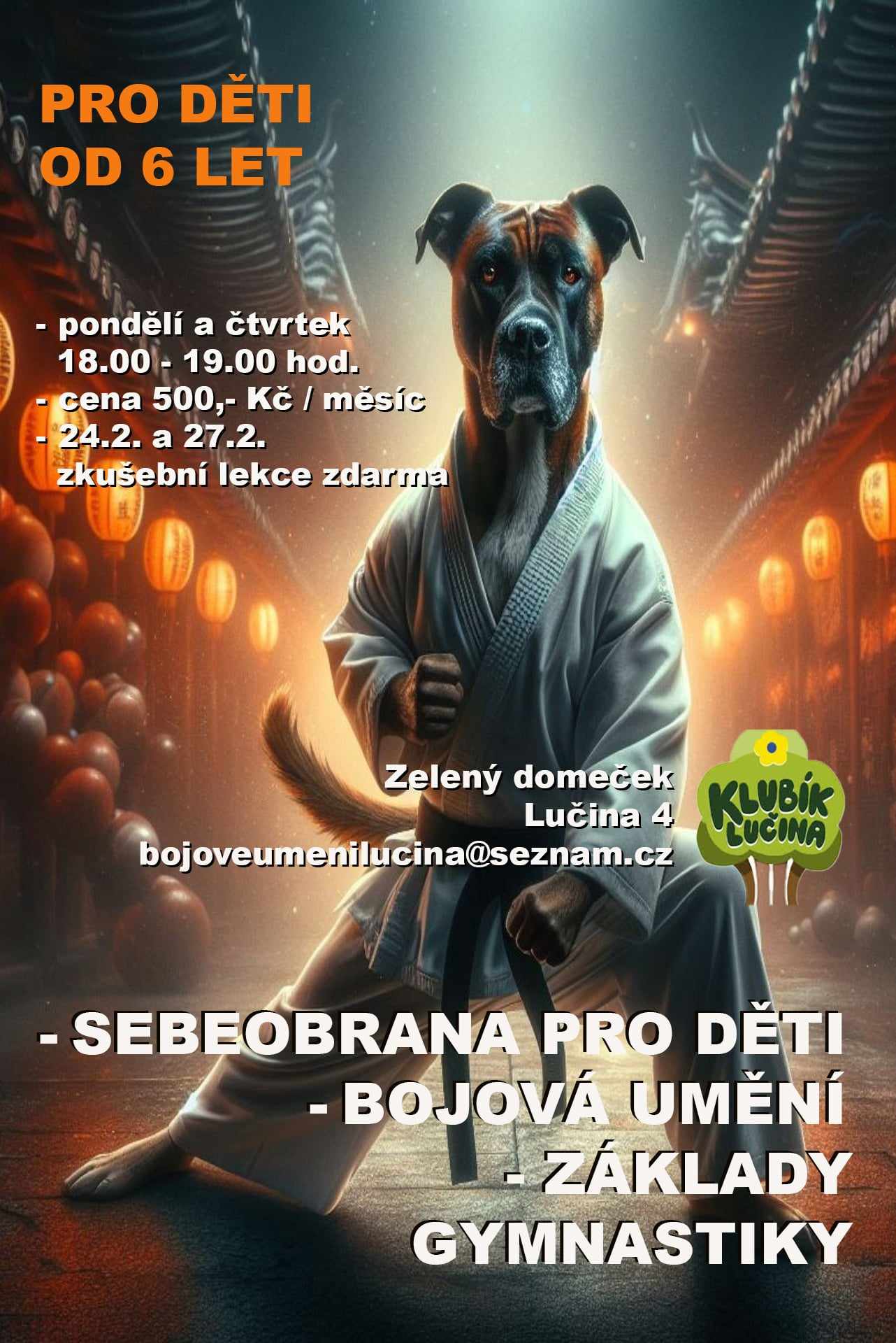 Pod záštitou Klubíku Lučina bude pro děti od 6 let pořádán zájmový kroužek "SEBEOBRANA - BOJOVÁ UMĚNÍ - ZÁKLADY GYMNASTIKY" každé pondělí a čtvrtek od 18.00 - 19.00 hod. Cena 500 Kč/měsíc. 24.02.2025 a 27.02.2025 zkušební lekce zdarma. Více informací v přiloženém plakátku.
