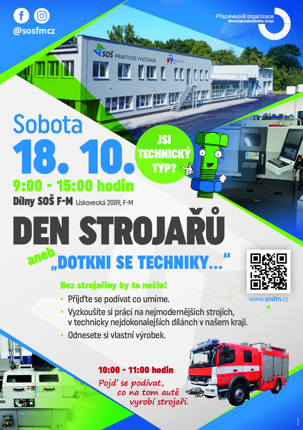 SOŠ Frýdek-Místek Vás všechny srdečně zve (rodinu, děti) na tyto akce, na té zemědělské uvidíte opravdu mnoho (můžete si zajezdit na strojích, uvidíte i muzejní kousky, vyzkoušíte ledasco ze zemědělských oborů, budou zde živá zvířata, lesní nauka, zahradníci, občerstvení k zakoupení, hudba, prostory školy i dílen budou otevřeny, medový stánek a spoustu dalšího (nové dílny automobilových oborů). Strojaři Vám zase ukáží, jak se pracuje v supermoderní dílně u strojů a že to dnes již není jen o špinavých monterkách. Zveme všechny bývalé absolventy i vyučující, širokou veřejnost. Pokud vyjde počasí, určitě si zpříjemníte den a uvidíte, že řemesla stále žijí.
