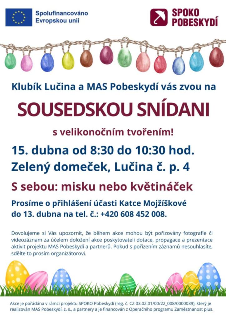 Klubík Lučina a MAS Pobeskydí Vás zvou na Sousedskou snídani s velikonočním tvořením v úterý dne 15. dubna 2025 od 8:30 do 10:30 hod. v Zeleném domečku. Prosíme o přihlášení účasti Katce Mojžíškové do 13. dubna na tel.č. 608 452 008.