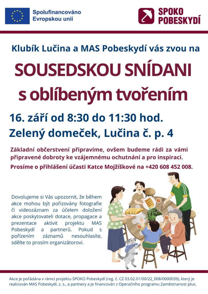 Klubík Lučina a MAS Pobeskydí Vás zvou na Sousedskou snídani s oblíbeným tvořením v úterý dne 16. září 2025 od 8:30 do 11:30 hod. v Zeleném domečku. Prosíme o přihlášení účasti Katce Mojžíškové na tel.č. 608 452 008.