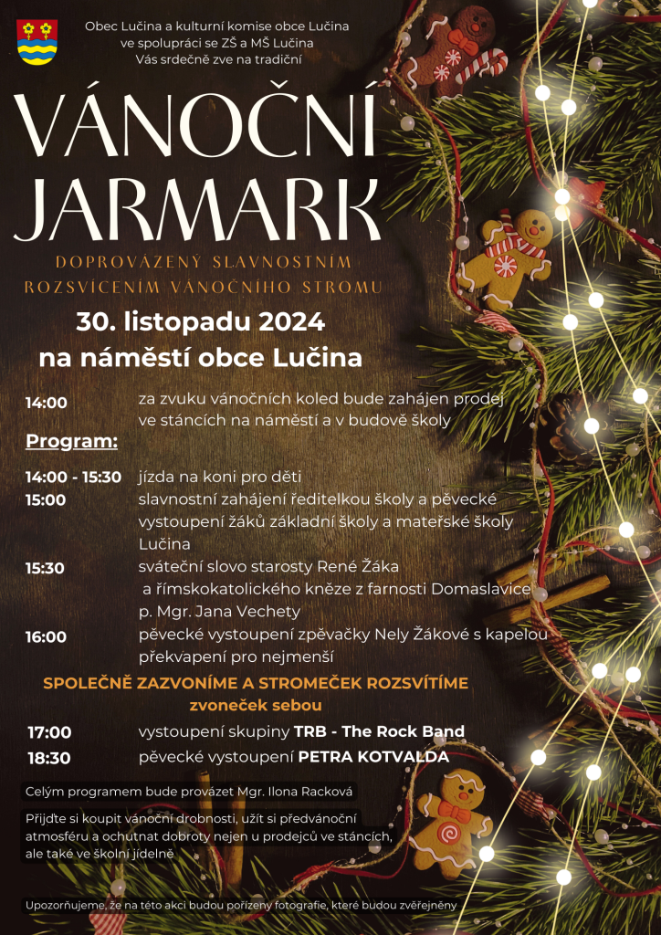 SRDEČNĚ VÁS ZVEME NA VÁNOČNÍ JARMARK OBCE LUČINA, KTERÝ SE BUDE KONAT V SOBOTU 30. LISTOPADU 2024 NA NÁMĚSTÍ OBCE LUČINA. ZA ZVUKU VÁNOČNÍCH KOLED BUDE VE STÁNCÍCH NA NÁMĚSTÍ A V BUDOVĚ ŠKOLY ZAHÁJEN PRODEJ. POTÉ BUDE NÁSLEDOVAT VÁNOČNÍ PROGRAM.