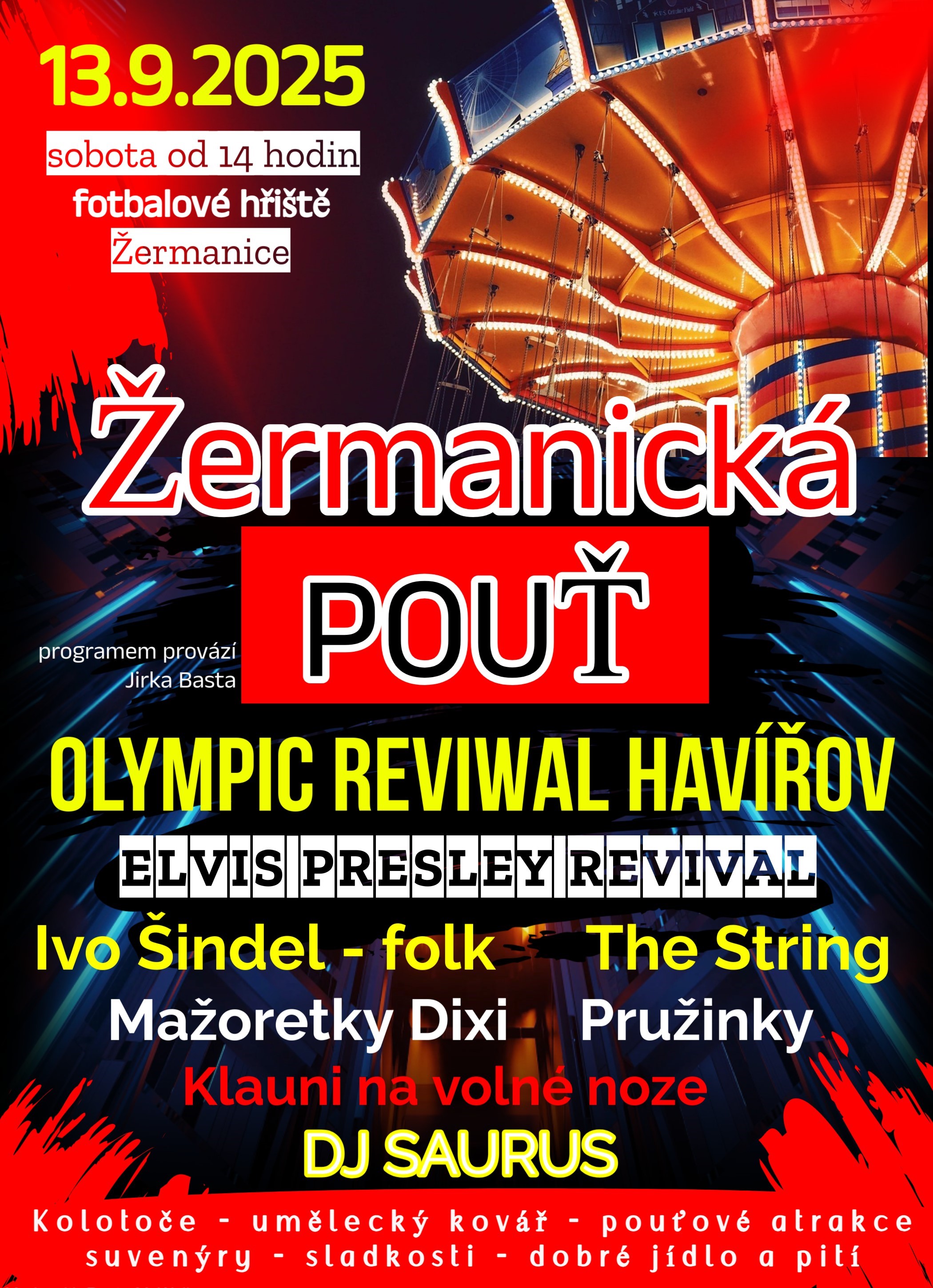 V sobotu 13.09.2025 od 14 hodin se na fotbalovém hřišti v Žermanicích uskuteční ŽERMANICKÁ POUŤ. Můžete se těšit na hudební vystoupení, kolotoče, pouťové atrakce a bohaté občerstvení. Programem Vás bude provázet Jirka Basta. Plakát v příloze.